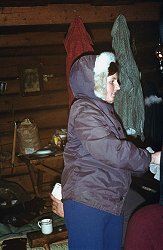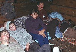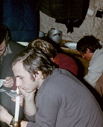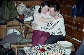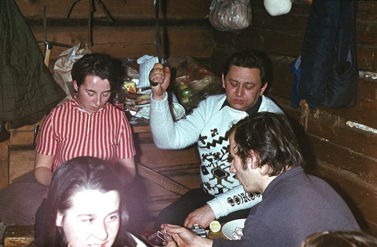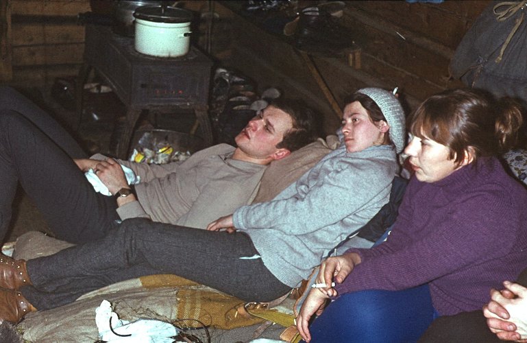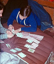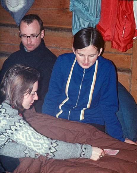 ![]() Grudzień'71. Ostatnia zima starej koliby - "Rysów". Ewa KuĽmińska, w ¶piworze Ania Bajtała, z tyłu Bożena Palmowska rżnie w karty. |