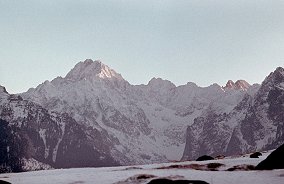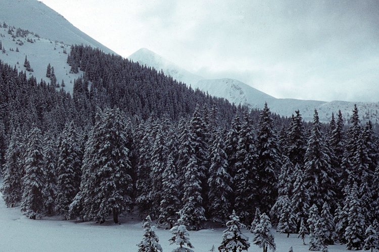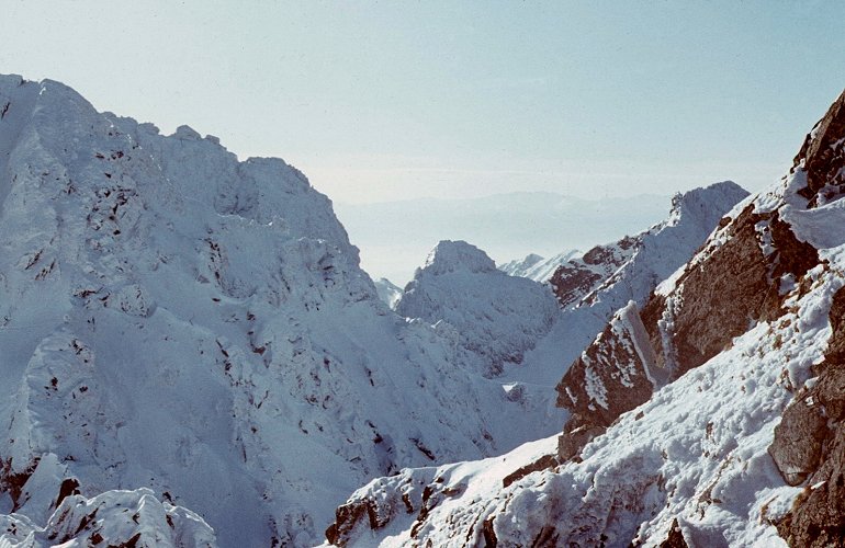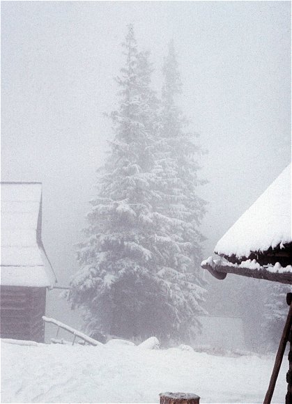 ![]() Grudzień'71. Zimowe mgiełki. Z lewej "Krywań", niżej dach Goliasa, z prawej fragment "Rysów". |