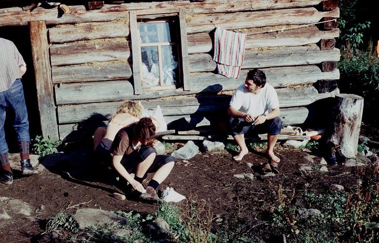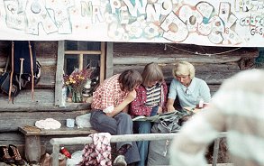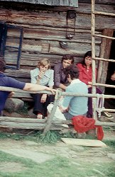 ![]() Sierpień'75. Od tyłu - ręka Jacka Frejlaka, Marysia. Pod ¶cian± koliby w ¶rodku - Józek Mazgaj (?). |