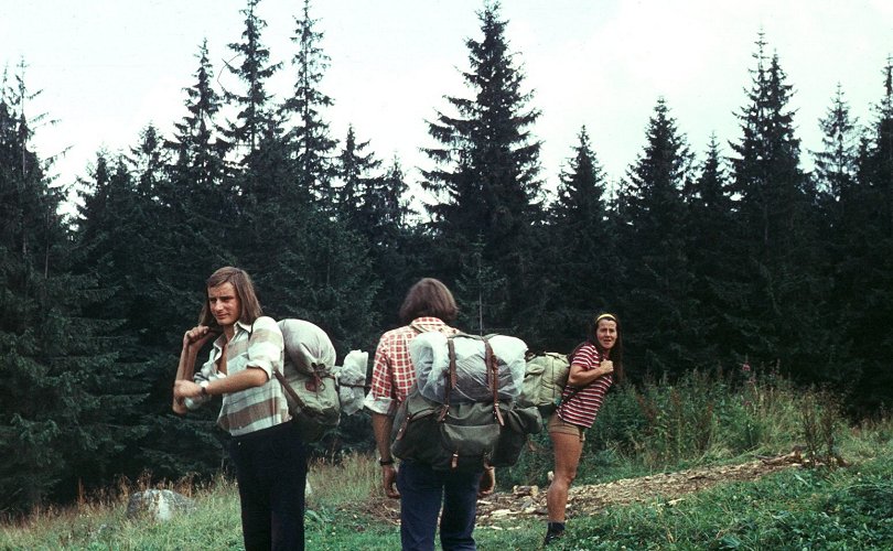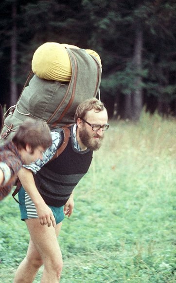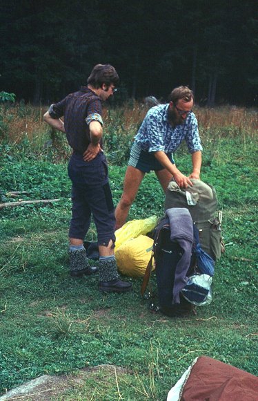 ![]() Sierpień'75. Na Słowację. Plecak Leszka, pod plecakiem Leszek. Z lewej głowa Tomka (?). |