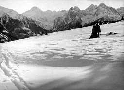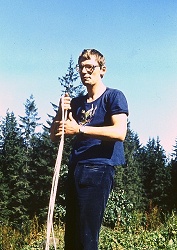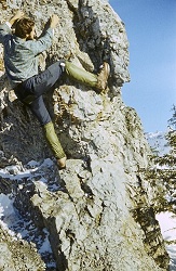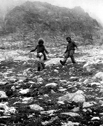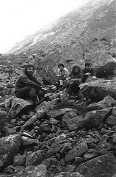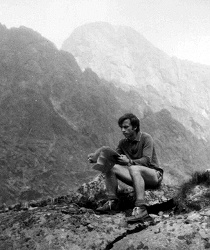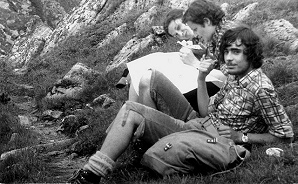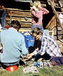 ![]() Wrzesień´75. Jedni sie relaksują, inni przygotowują sprzęt do wspinaczki: Pysio ze współwspinaczem. |