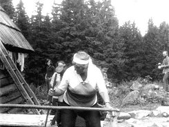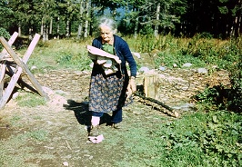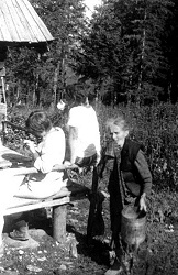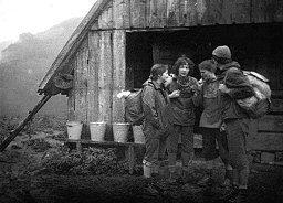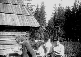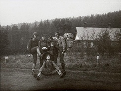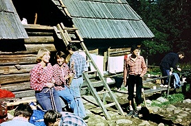 ![]() Wrzesień´75. Przed "Krywaniem". Z prawej Irka Pawlik i Babka w drodze po drewno. |