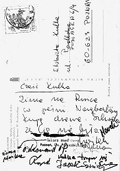 ![]() Na początku listopada´74 dostałam pozdrowienia z Rusinki od ekipy przygotowującej opał na zimę. Kartka datowana - 4.11.1974. Podpisali się: Wojtek, Mańcia, Marek, Jadwiga, o. Leonard OP, Ewa, Jacek Sznirch i ktoś jeszcze - może Gaba, może Leszek? |